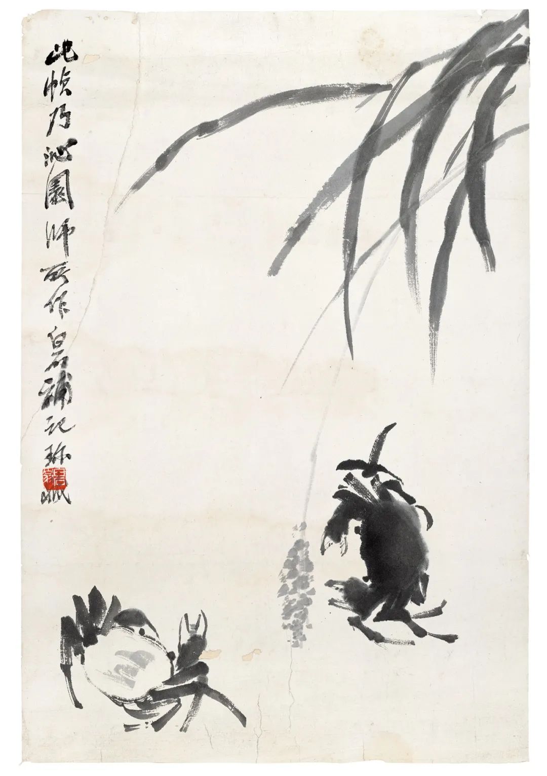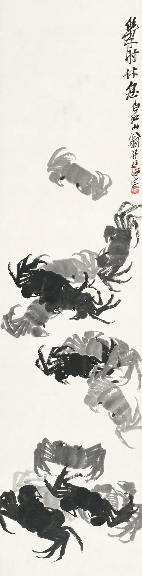 我们都已熟知齐白石画蟹一绝,可与他的虾相媲美,他三笔画出一个蟹壳的方法,在现在的儿童国画班中,依然在使用。这样活灵活现的螃蟹画法,是在他五十多岁“衰年变法”之后才开始的,此时的他已经对笔墨的掌握极为精准,加之经过了一遍遍的实验,把儿时在乡野池塘边看到的螃蟹行走的样子,化为笔墨之间黑与白的关系,蟹壳的凹凸、蟹爪的锐利和蟹腿上细腻的绒毛感,笔笔精简,笔笔精到,令人叹服。