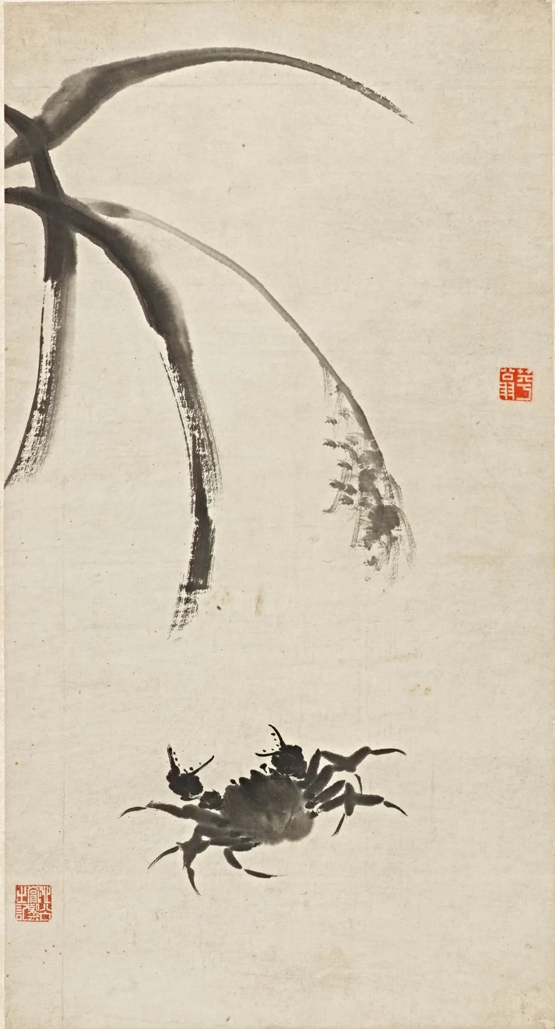 齐白石跟随胡沁园学习之后,就不再做雕花木匠,一心学画和诗,胡沁园擅长画工笔画,也画写意花鸟画,胡沁园这张《草蟹图》,有徐渭和八大写意的影子,潇洒飘逸,看起来似乎更多为怡情。齐白石早年的这张《芦蟹》,从芦花到螃蟹都和胡沁园的《草蟹图》有着诸多相似之处,但在蟹脚的刻画上更为细致和写实,更注意表现蟹脚的尖锐和螃蟹行走的动感,而并非几笔草草了事,其中已见齐白石的心思,天资不可欺,直觉这个东西挡都挡不住。